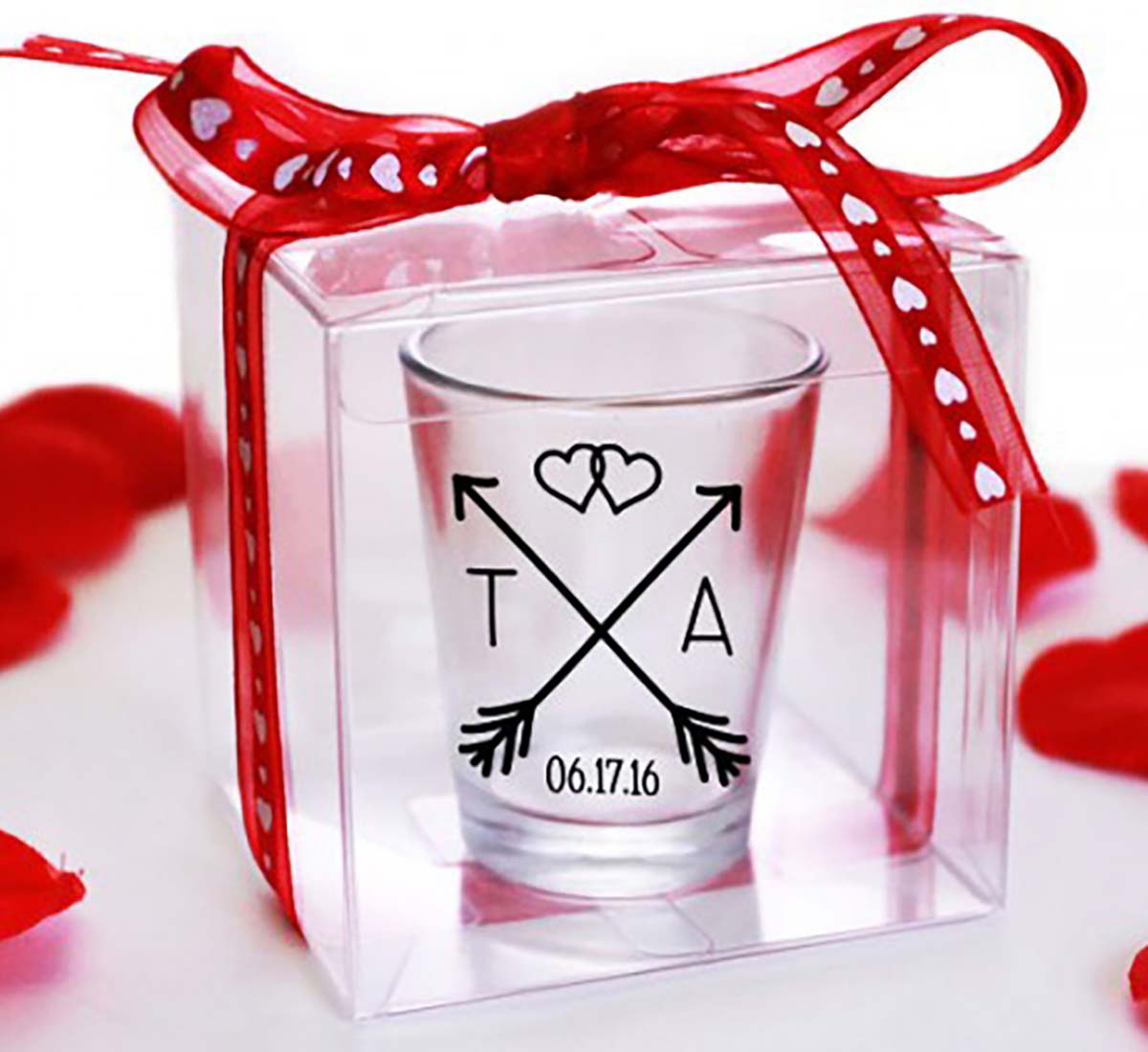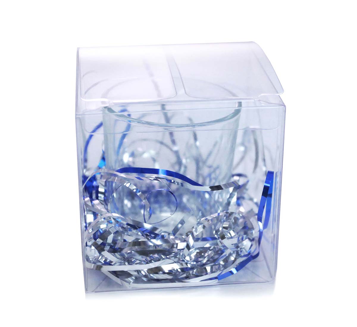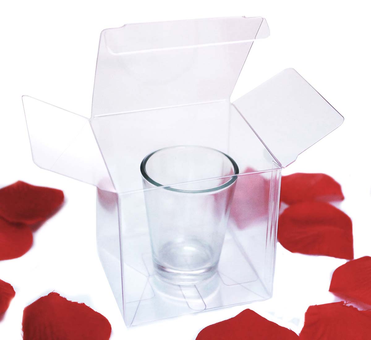 Clear gift boxes are the perfect sized boxes to hold anything from our standard sized 1.75 oz shot glasses to our 3 oz Votive Candle Holders. They display your event favors in an elegant and cute fashion. They take only seconds to put together and will be a stunning additional to your custom shot glasses!